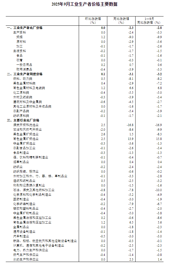 2025年9月份,全国工业生产者出厂价格同比下降2.3%,降幅比上月收窄0.6个百分点,环比继续持平。工业生产者购进价格同比下降3.1%,降幅比上月收窄0.9个百分点,环比上涨0.1%。1—9月平均,工业生产者出厂价格比上年同期下降2.8%,工业生产者购进价格下降3.2%。