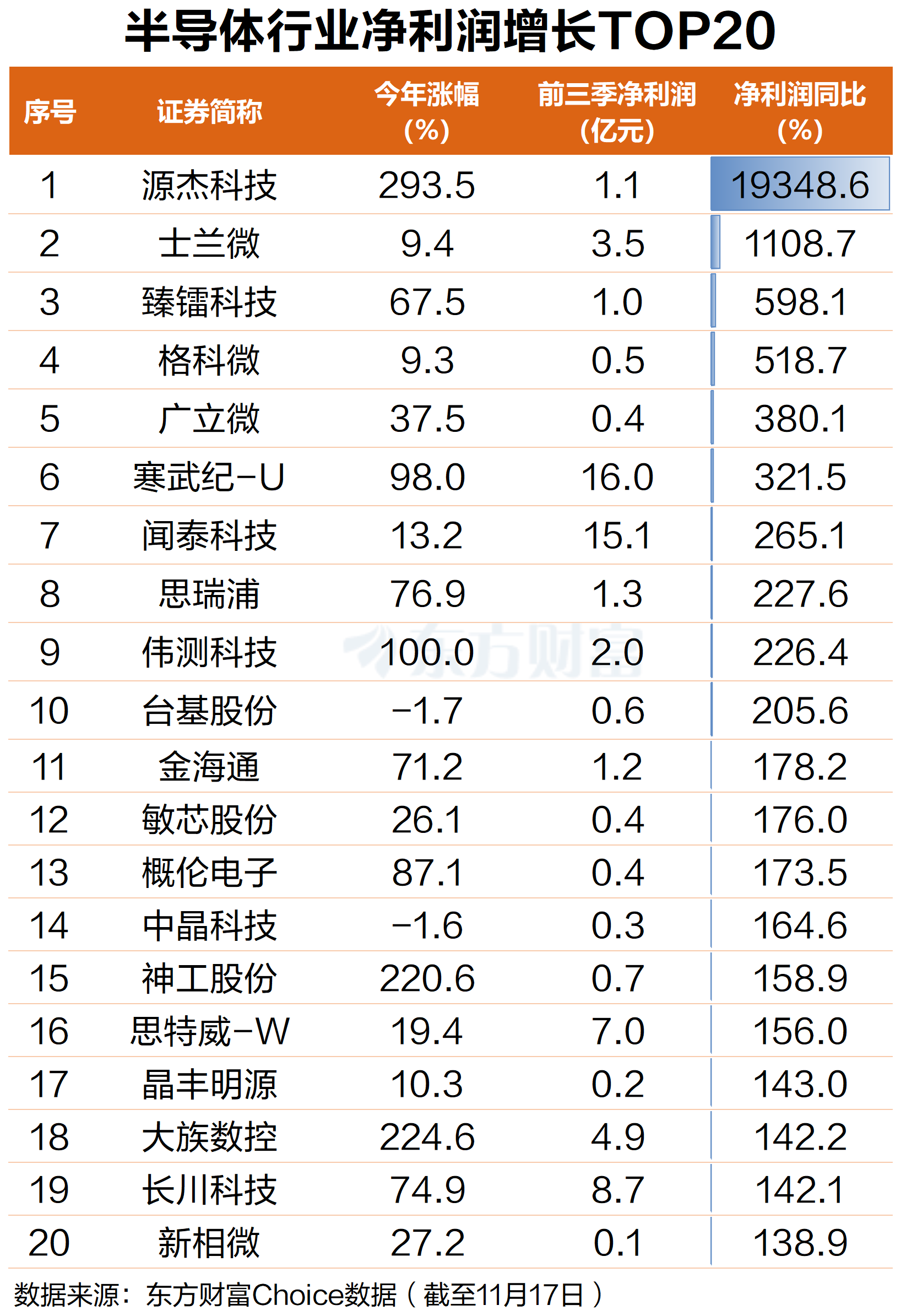 业绩方面,这167股前三季度净利润同比增幅中位数为18.42%,较去年同期增加了11个百分点;其中,有108股今年前三季度净利润同比增长,占比65%,较去年同期上升了18家。有32股前三季度净利润同比翻倍,源杰科技同比增超19倍,士兰微同比增超11倍,臻镭科技、格科微等均同比增超5倍。
