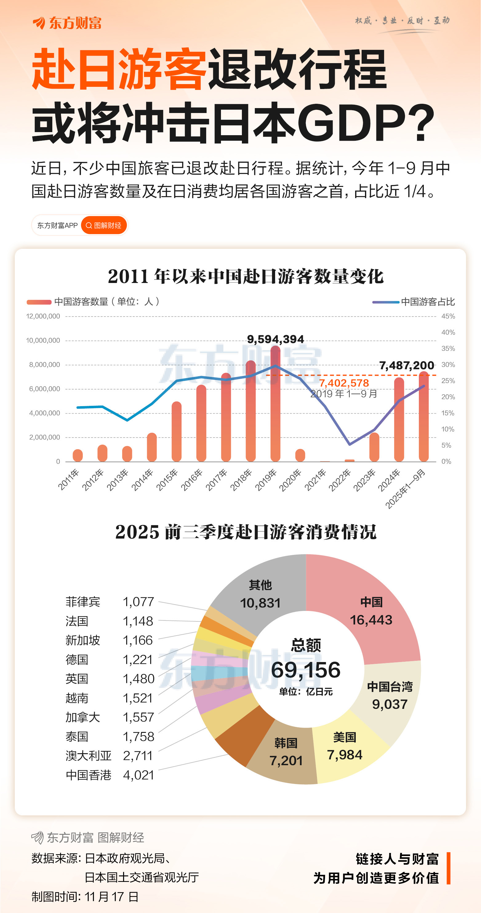 日本政府观光局数据显示,2025年前三季度,日本共接待外国游客3165.1万人次,来自中国内地的赴日游客数量达748.72万,较上年同期增长42.7%。这意味着,仅中国内地就超过韩国,成为日本第一大外国游客客源地。另据央视新闻消息,日本野村综合研究所研究员木内登英在11月16日表示,若访日中国游客大幅减少,日本国内生产总值将减少0.36%,初步计算经济损失将达2.2万亿日元,约合人民币1011.6亿元。