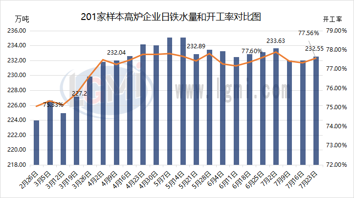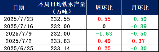 2025年7月23日,据兰格调研,全国201家生产企业铁水日均产量为232.55万吨,周环比增加0.55万吨,总体月环比减少0.59万吨;25年5月日均铁水产量为234.14万吨,25年6月日均铁水产量为232.95万吨,25年7月日均铁水产量为232.18万吨。