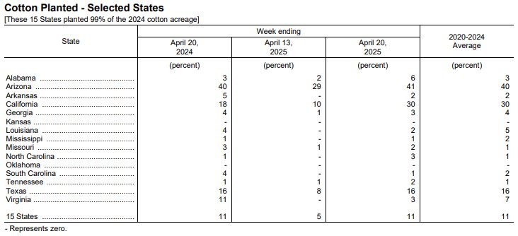 据美国农业部网站消息,美国农业部(USDA)在每周作物生长报告中公布称,截至2025年4月20日当周,美棉种植率为11%,前周为5%,去年同期为11%,五年均值为11%。