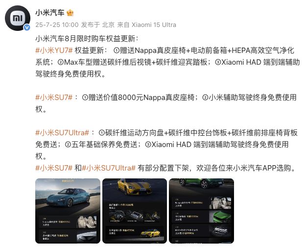 7月25日,小米汽车更新8月限时购车权益,其中小米YU7全系赠送Nappa真皮座椅+电动前备箱+HEPA高效空气净化系统,以及Xiaomi HAD端到端辅助驾驶终身免费使用权。此外,小米YU7 Max车型赠送碳纤维后视镜+碳纤维迎宾踏板。与7月限时购车权益相比,8月下定购买小米YU7,主、副驾零重力座椅不再免费送。