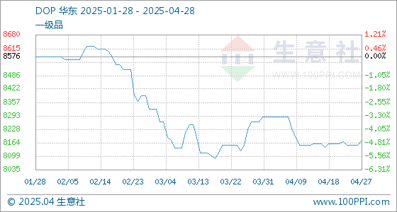 4月28日,生意社DOP基准价为8175.84元/吨,与本月初(8288.75元/吨)相比,下降了-1.36%。