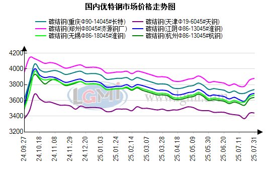 市场方面:现货方面,昨日早间优特钢市场开局继续持货企稳,随着盘面深绿加上难以打开的成交,部分优惠灵活报价重回视野,高位多有10-20元左右幅度左右的回落,即便如此,买卖冷清,到了午后,场面维持,优特钢市场各方或等待跨月后再行调整应对。分地区来看,华东地区碳合结钢资源锡杭等地主流报价主稳,多地叫卖声较前期减少,而当地轴承、铬钼钢等资源主流小幅回落10元左右,限量优惠特价的呼声明显增强;华北、华中地区优特钢市场继续高价之中有小灵活,因昨日原料端盘面跳水优特钢市较之前的强势缓和许多,部分让利促销的动作增加。其中碳合结钢资源主流报价高位弱稳间,齿轮、模具钢资源小幅下跌,跌后成交依旧清淡。综上,昨日7月收官日并无惊喜出现,原料盘面深绿破关,优特钢市买卖一直以少量刚需为主,总体交投难提振,商家反馈艰难,如此,优特钢市场各方期待本月迎来改善及好转机会。