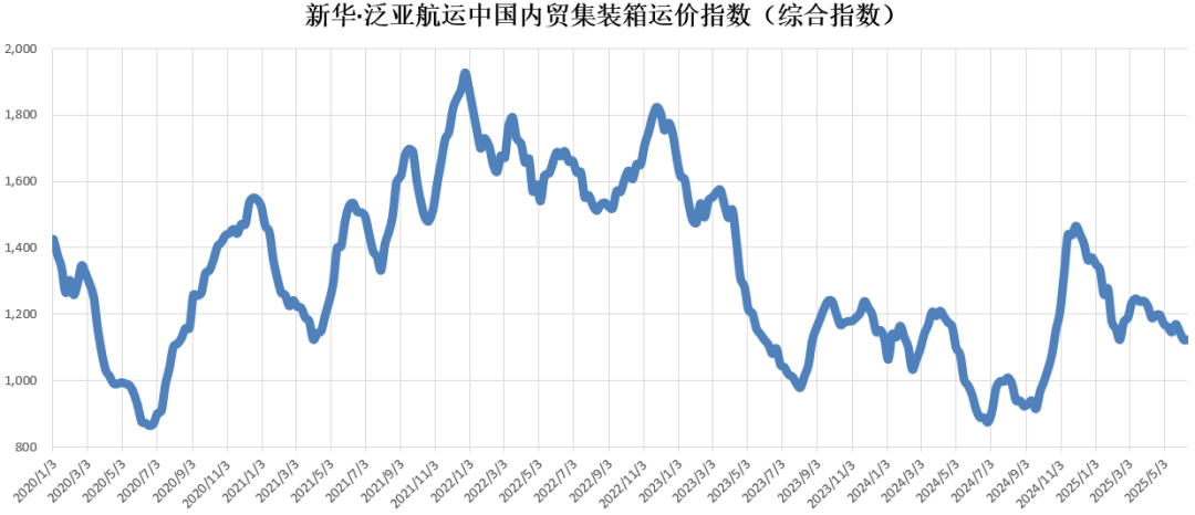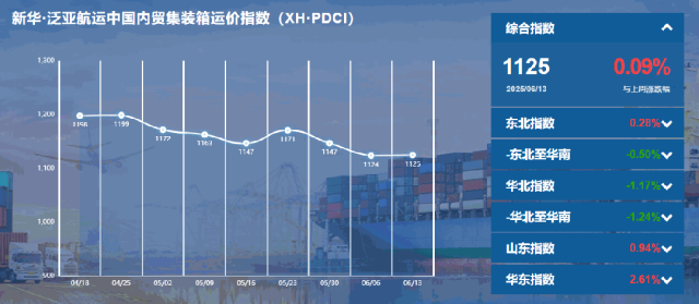 核心提示:本期(6月7日至6月13日),新华·泛亚航运中国内贸集装箱运价指数(XH·PDCI)报1125点,较上期(5月31日至6月6日)上涨1点,涨幅0.09%;同比上涨235点,涨幅26.4%;6只区域子指数“四涨两跌”,4只流向子指数“同步下跌”。