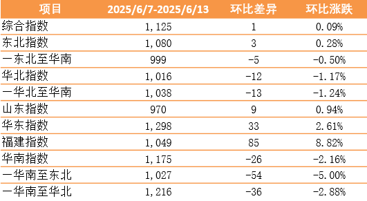 此外,山东指数报970点,环比上涨9点,涨幅0.94%;华东指数报1298点,环比上涨33点,涨幅2.61%;福建指数报1049点,环比上涨85点,涨幅8.82%。