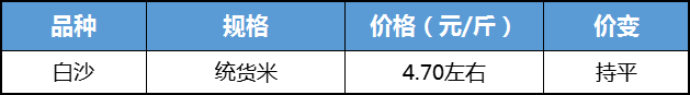 河南正阳产区基层货源剩余零星,贸易商谨慎随行补货,行情清淡,价格稳定。当前白沙统货米价格多在4.50-4.60元/斤,7个筛上精选米5.00元/斤左右。