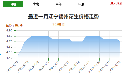 吉林扶余产区花生上货量有限,采购商多刚需补货,主流行情清淡,成交价格稳弱。目前当地308花生统货米价格4.70-4.75元/斤。