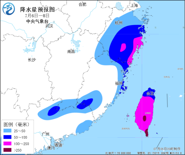 降水预报:6日至8日,台湾、福建沿海及北部和西南部、浙江、江西南部、广东北部等地有大到暴雨,台湾中南部、浙江南部及沿海等地部分地区大暴雨,台湾南部局地特大暴雨。6日降雨主要出现在台湾,7日至8日主要在福建、浙江等地。