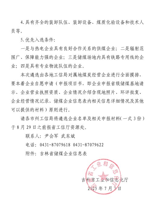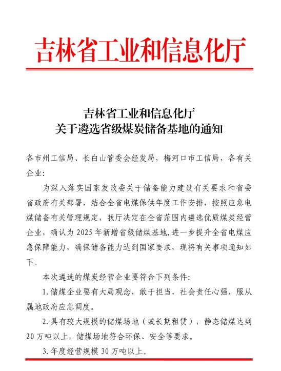 吉林省工业和信息化厅发布关于遴选省级煤炭储备基地的通知。