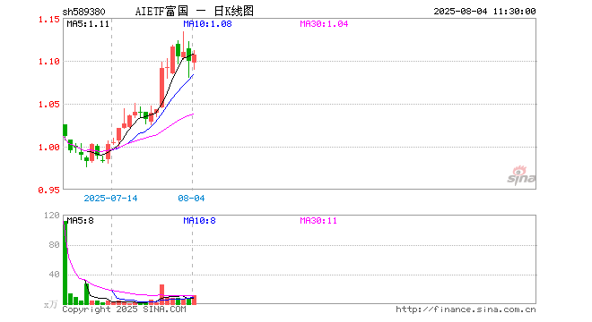 8月4日,截止午间收盘,AIETF富国(589380)涨0.73%,报1.107元,成交额1282.99万元。AIETF富国(589380)重仓股方面,寒武纪截止午盘涨0.51%,澜起科技涨1.87%,金山办公跌0.66%,芯原股份涨7.40%,石头科技涨3.81%,恒玄科技跌1.40%,晶晨股份跌0.61%,复旦微电涨3.41%,中科星图涨4.39%,道通科技跌0.88%。