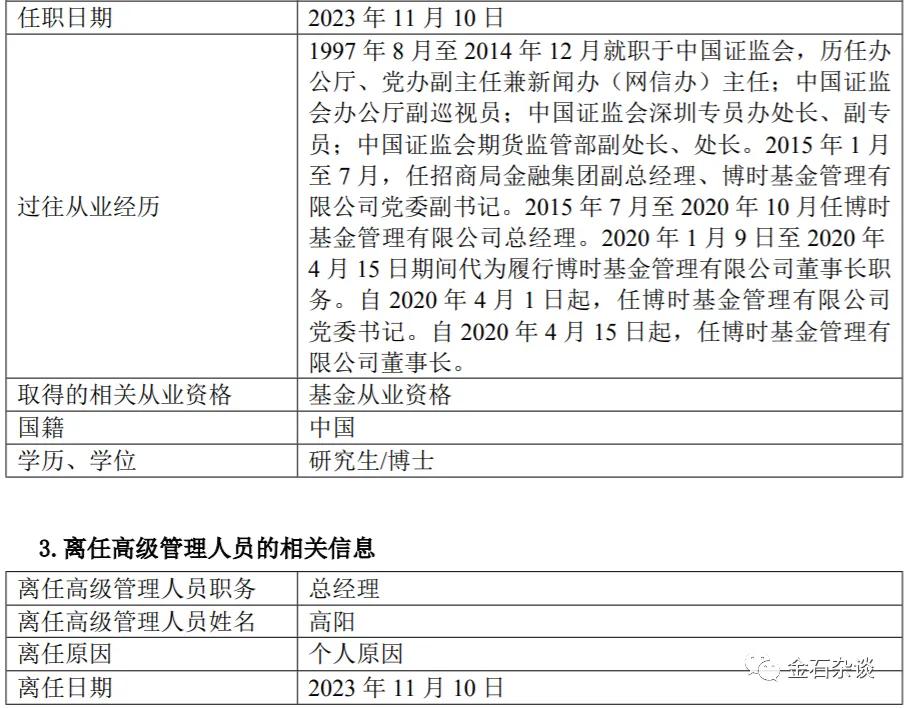 2)2023年11月中旬,博时原总经理高阳因个人原因离任,而其任职时间尚不足3年。值得注意的是,这也是高阳第二次离开博时。12月,天弘官宣高阳接任韩歆毅担任总经理。
