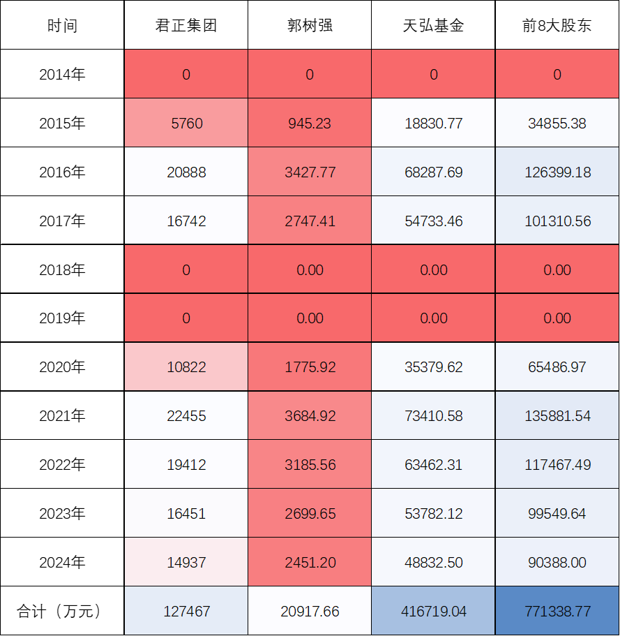 此外,根据历年君正集团分红情况,我们可以倒退天弘基金分红情况。根据统计,2014年至2024年的天弘基金分红,郭树强累计获得2.09亿分红,考虑到2023年7月已离职,2014年至2022年分红总计1.58亿元。不过即便离职了,如果郭树强还未退股,依然会有稳定的分红,这两年分红超5000万,着实让人羡慕。