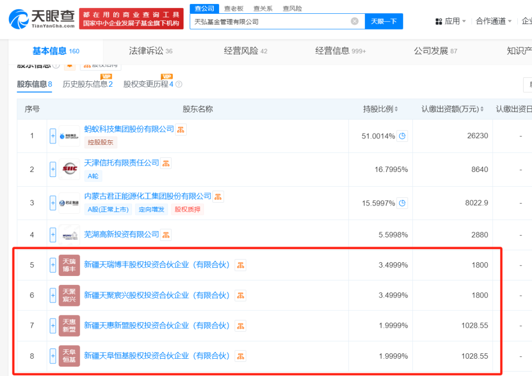 根据天眼查,天弘基金由蚂蚁就谈持股51%,天津信托持股16.8%,君正集团(5.340, 0.02, 0.38%)持股15.6%,芜湖高新投资持股6%;而公司四大员工持股平台,分别持股3.5%、3.5%、2%和2%。