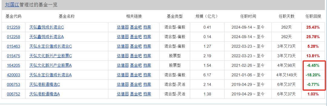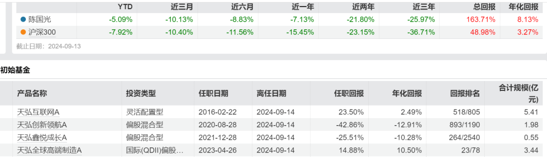 还有一点,刘国江业绩好的产品——天弘鑫悦成长混合,其实是去年9月才接管(吃到了924以来大行情),其前任陈国光(天弘10年任职老将)任职期间大亏26%。而陈国光管理的多款产品任职亏损超20%,甚至亏损超40%。彼时的离任原因是工作需要,这大概率就是“被离职”了。
