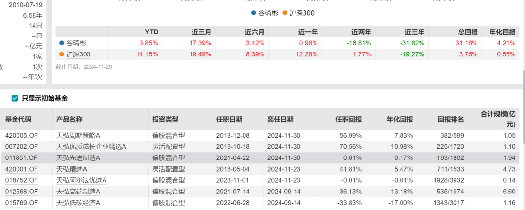 而他接管的天弘周期策略和天弘低碳经济混合,都是由基金经理谷琦彬管理,他曾任职中信证券(25.590, 0.07, 0.27%)、瑞银证券、国君证券,2015年11月加盟天弘,18年开始管理产品,同样是天弘自己培养的老将。