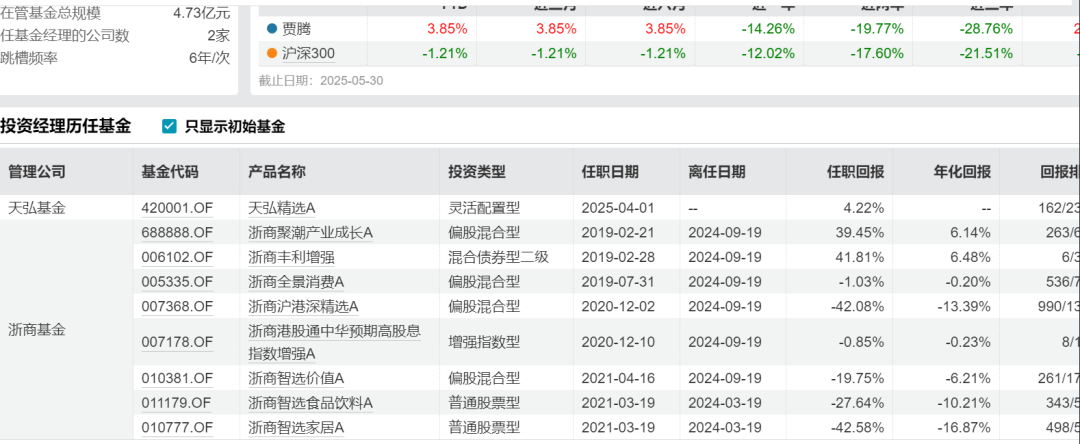 6)同样在4月,天弘基金还从浙商基金挖来权益“一哥”贾腾担任天弘精选混合的基金经理。曾经的百亿公募基金经理如今的管理规模不足5亿。关键的问题是,贾腾还是浙商基金权益投资总监。