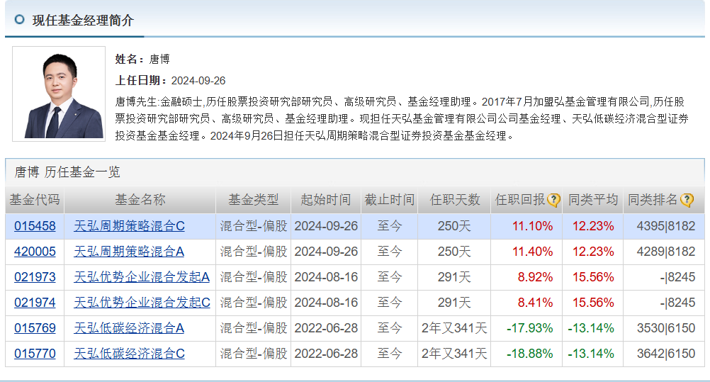 3)基金经理唐博,17年加入天弘,前两年管理的天弘低碳经济混合任职亏损18%,wind显示其年化回报-8%。同样,他的管理的多只基金也是2024年8月以来接管,所以收益比较好。