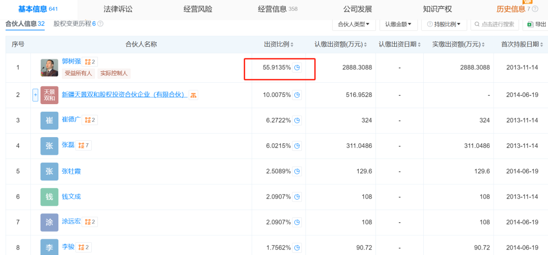 截至目前,郭树强依旧持有新疆天瑞博丰股权投资合伙企业(有限合伙)55.9135%的股权,而且首次持股日期2013年,至今已有12年,2014年开始注册资金跟现在相当;此外,他还持有新疆天阜恒基股权投资合伙企业(有限合伙)30%的股权,自2014年就一直持股30%。因此,郭树强间接持有天弘基金2.56%的股权。