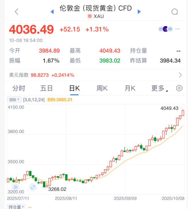 现货金价首次突破每盎司4000美元