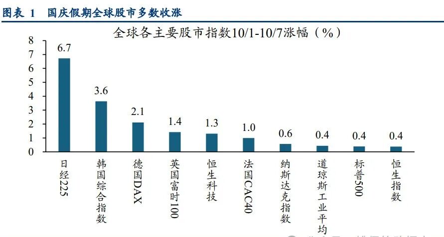 据华创证券统计,这个长假,标普500指数、道指和纳指分别上涨0.4%、0.4%和0.6%;此外,英国富时100、德国DAX和法国CAC40指数分别上涨1.4%、2.1%和1.0%。亚洲市场表现更强,日经225指数涨6.7%,韩国综合指数涨3.6%,恒生指数、恒生科技指数分别涨0.4%、1.3%。