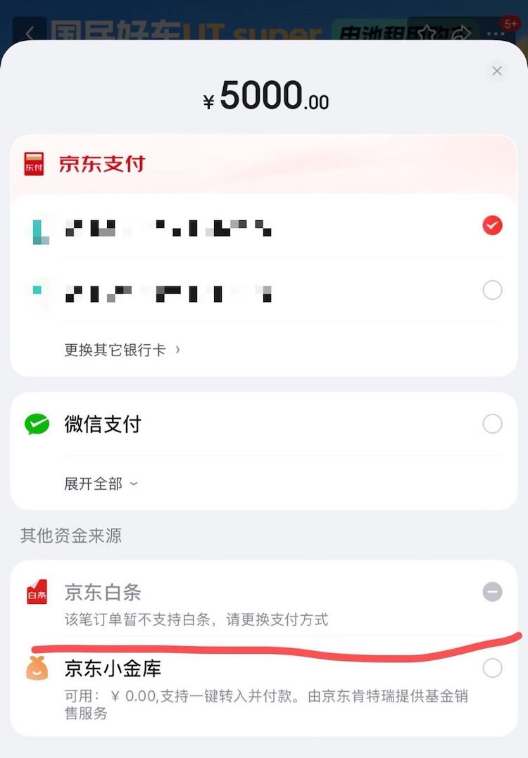 记者实测发现,目前5千元定金暂不支持打白条,但500元意向金可以打京东白条,支持6期免服务费。