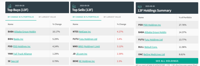 此外,高瓴HHLR还对富途、网易、逸仙电商、京东、贝壳进行了减持。截至三季度末,HHLR Advisors的前十大重仓股分别是,拼多多、阿里巴巴、富途、微牛、百济神州、百度、传奇生物、网易、ArriVent BioPharma、贝壳。