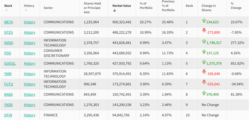 三季度,景林新进了新思科技、联合健康、苹果等9股,清仓了大全新能源、携程、百济神州以及禾赛科技等多股。截至三季度末,景林的前十大持仓分别为META、网易、英伟达、拼多多、谷歌、满帮、富途、阿里巴巴、YNDX、奇富科技,合计占总持仓的82%。