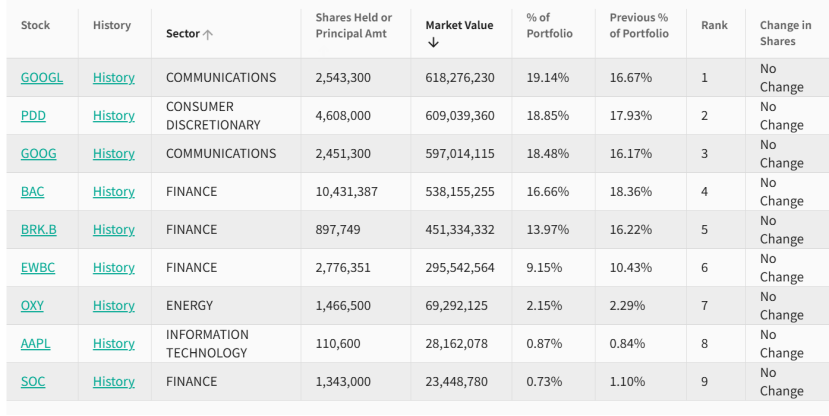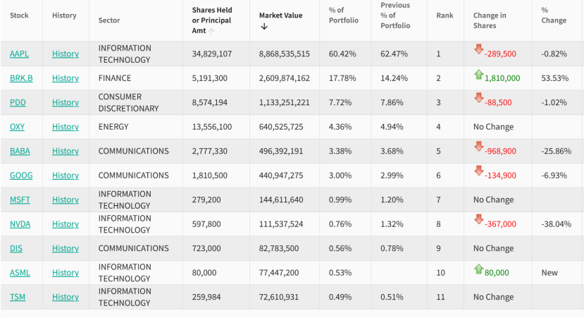 截至三季度末,H&H 基金的前十大重仓股分别为苹果、伯克希尔B、拼多多、西方石油、阿里巴巴、谷歌、微软、英伟达、迪士尼、阿斯麦。其中,苹果仍然是第一大重仓,经历连续四个季度减持后,期末持股市值仍高达89亿美元,占总仓位的60%。