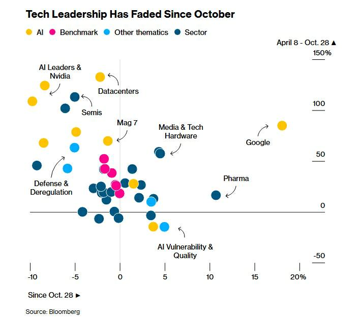 加拿大皇家银行资本市场策略师卡瓦斯纳(Lori Calvasina)称:“美股领涨板块的轮动已经开始。在过去几个月里,我们与机构投资者的会面中,对AI交易、美股七巨头和市场集中度的担忧情绪日渐高涨。”“七巨头”中的多只股票也陷入困境,Meta Platforms的股价自10月28日标普500指数达到峰值以来甚至已下跌14%。